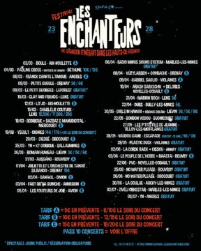 Pour sa 23ème édition, le festival revient cette année sur 3 périodes distinctes, du 3 mars au 23 avril, du 20 mai au 4 juin et du 22 juin au 3 juillet. D’année en année, le festival ne cesse de grandir et il passera en 2022 dans pas moins de 28 villes. Une programmation pour 28 concerts toujours aussi éclectique : Boule ouvrira la scène le 3 mars à Aix-Noulette, ville où siège de l’association – il avait déjà séduit une première fois le public Enchanteurs il y a 2 ans en ouverture de Didier Super ! Et pour clôturer cette première période enchanteresse, le public pourra retrouver Ours, Charles Souchon alias OURS, à Bully-les-Mines, le 22 avril.